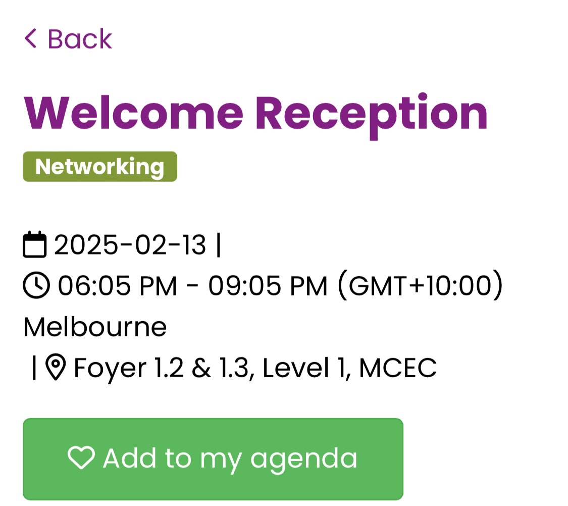 You can add here your favourite sessions by clicking on the green button in the session description.